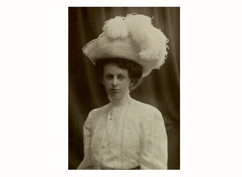 Kvinnoporträtt. Karin Rosell i höghalsad blus och stor hatt med plymer.