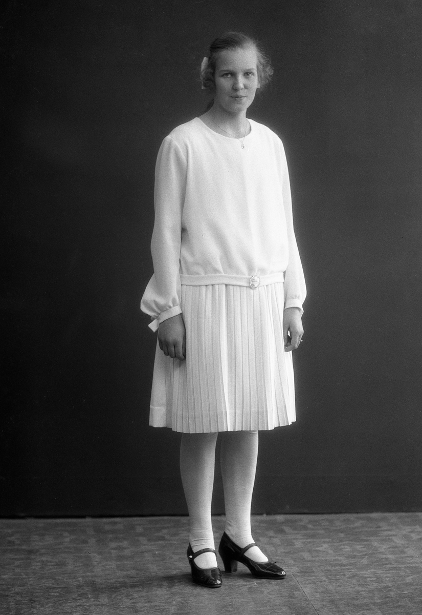 Två ateljéfoton av en flicka i tidstypisk klänning med lågt liv och remsko med klack. Troligen ett konfirmationsporträtt. Ekengren, Varberg.