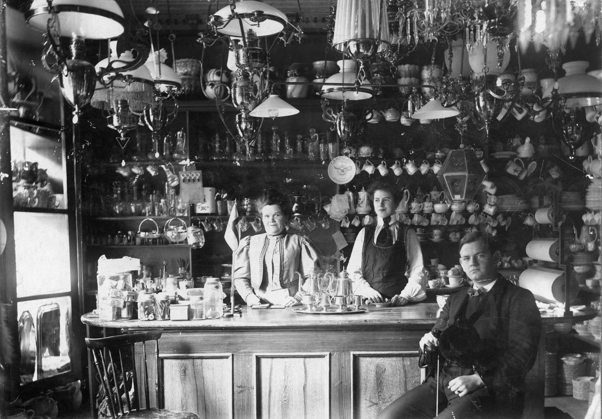 Linda Hansons Bosättningsaffär, "Lallas filial i Falkenberg". Taket dignar av lampor och bakom expediterna är hyllorna fulla av karaffer, porslinsserviser, ytterfoder m m. Fr v Julie Hermansson (syster till Linda Hanson) och t h Tora Pettersson. Framför disken sitter ingenjör Arvid Lundquist.