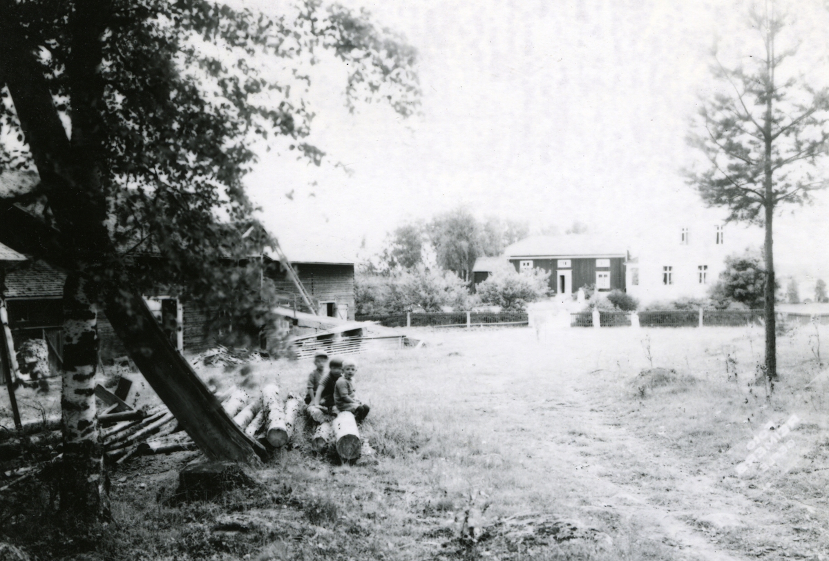 Herte Pensionat i Bollnäs, 1928. Tre små pojkar sitter på några timmerstockar och tittar intresserade mot kameran.