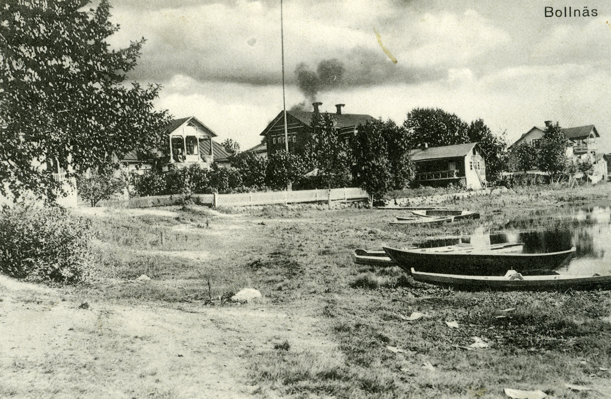 Gårdar intill en strandkant i Bollnäsområdet. Några båtar ligger i vattnet.