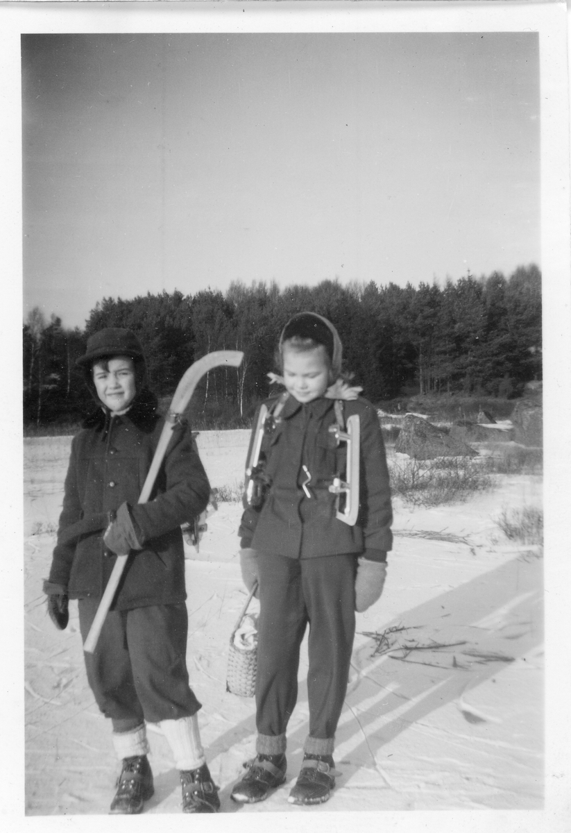 Lennart Gunnarsson och Gudrun Olsson står i ett vinterklätt landskap, troligtvis i Tutjärn, Kållered 1954. Lennart står med en bandyklubba i handen och Gudrun har ett par skridskor runt halsen. Barnen har fika med sig.