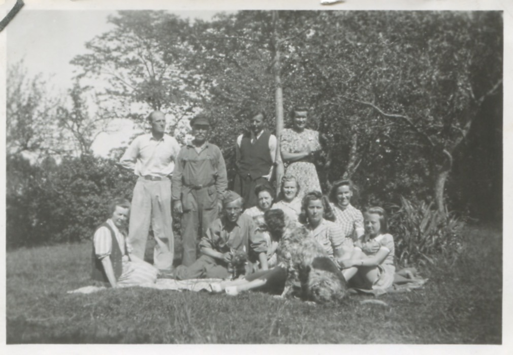 Tolv personer befinner sig i det gröna, Sporred "Fredriks" 1:8 1940-tal. Stående från vänster: Okänd gäst, Fredrik, Okänd, Agnes. Sittande från vänster: Okänd, Gunnar, okänd gäst, Estrid, Astrid, Iris "Issi" Larsson (1916 - 2005), gäst.