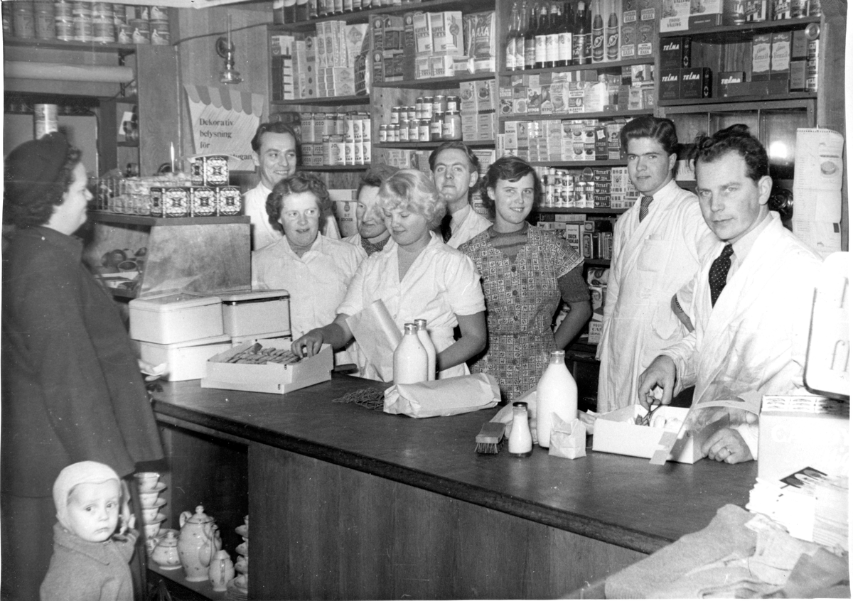 Lindgren & Petterssons lanthandel på Gamla Riksvägen 42, 1950-tal. Åtta personer står bakom disken. Från vänster: 1. Rune Engström. 2. Rose Maj Benkel. 3. Frida Eriksson. 4. Barbro Eriksson. 5. Helmer Lindström. 6. Gunnevi (finskt krigsbarn). 7. Erland Johansson. 8. Per Olof Lindgren. Okänd kvinnlig kund står framför disken.