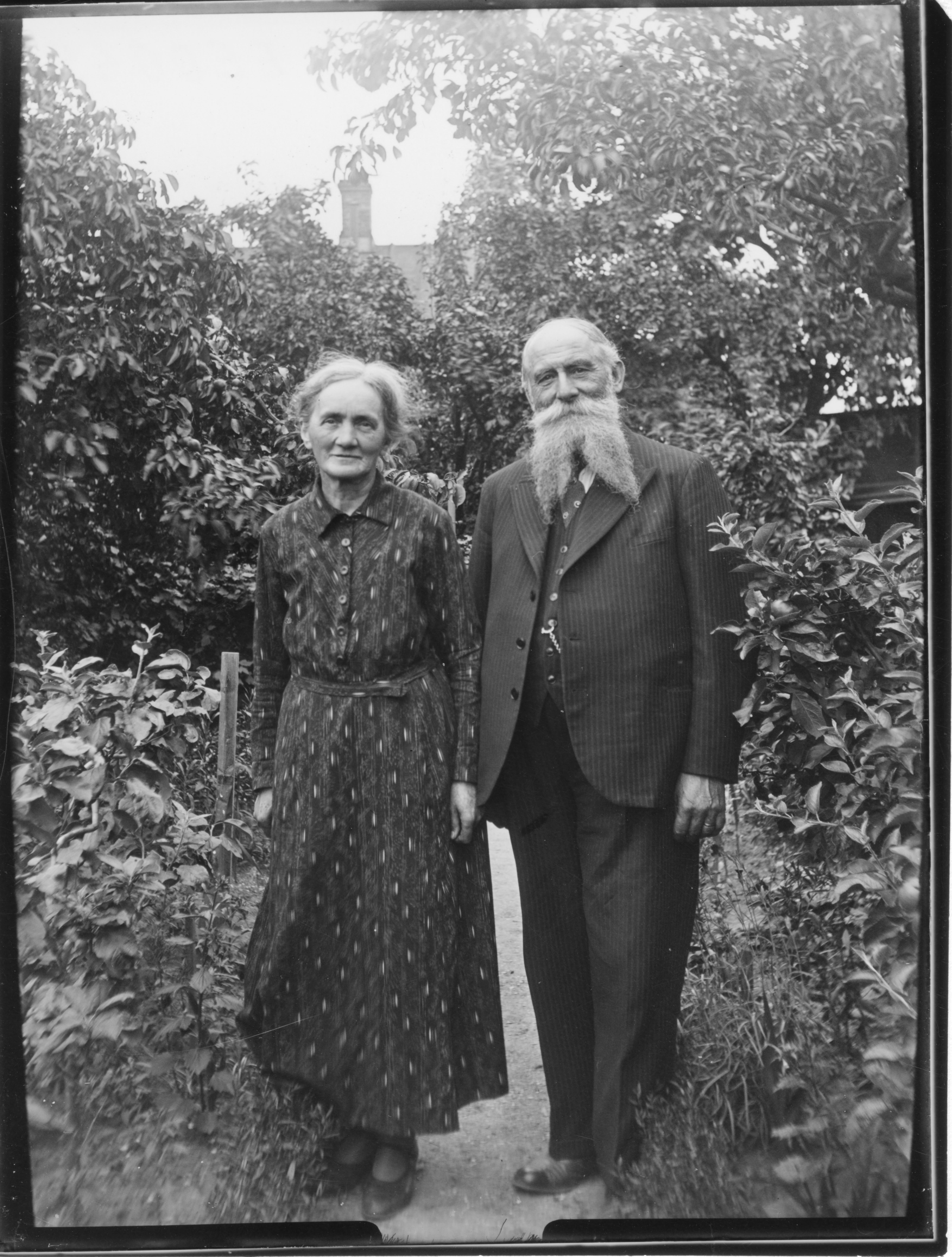 Målarmästaren Olof Nilsson, född 1865, och hans hustru i en trädgård, troligen vid deras hus på Ludvigsgatan 5 i Kulladal i Malmö.