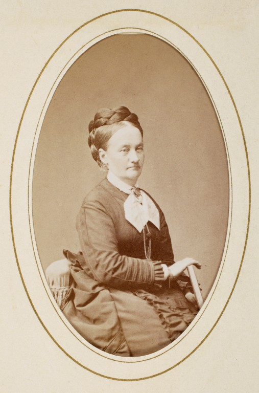 En sittande medelålders kvinna i mörk klänning med ljus jabot och en brosch i halsgropen.