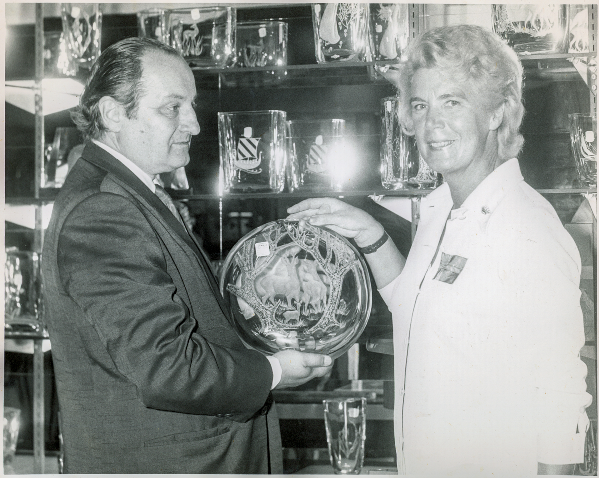 Glasdesignern Asta Strömberg, Strömbergshyttan, och en okänd man i kostym visar upp ett arbetat fat vid en glasutställning, trol. utomlands.