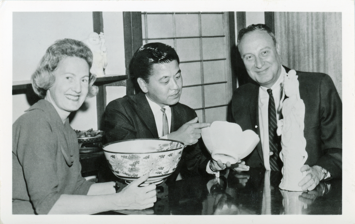 Ett (trol. amerikanskt) par tillsammans med en japansk herre, med några dekorerade porslinsskålar på ett bord framför sig.