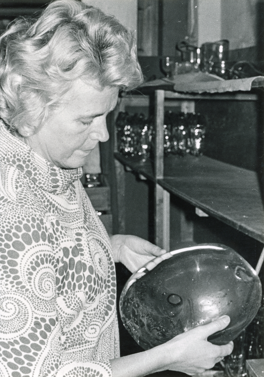 Glasdesignern Asta Strömberg, Strömbergshyttan, i stormönstrad tunika, synar en glasskål.