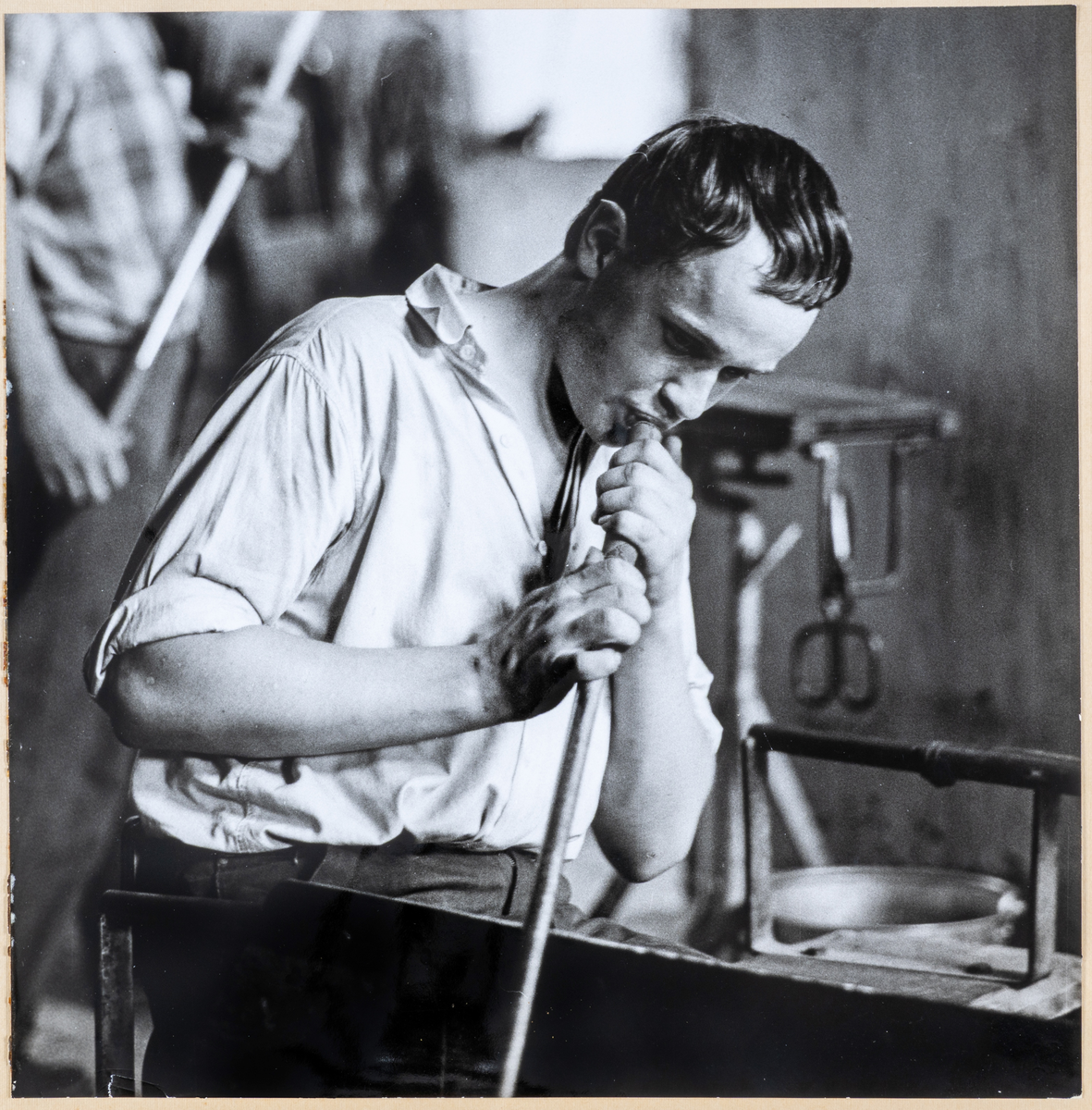 Arbete i hyttan på Strömbergshyttan. En ung man blåser i en glasblåsarpipa.