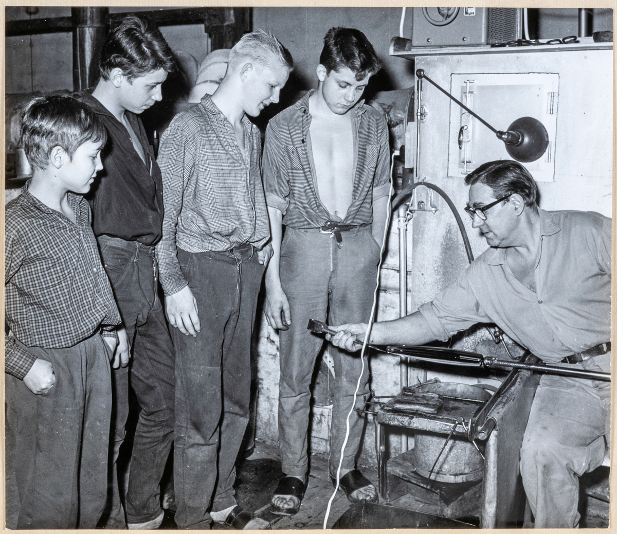"Gösta o Rolf Brodin, Claes Göran Hjelmér samt Sölve Alex tittar på när jag driver upp ett blomglas".