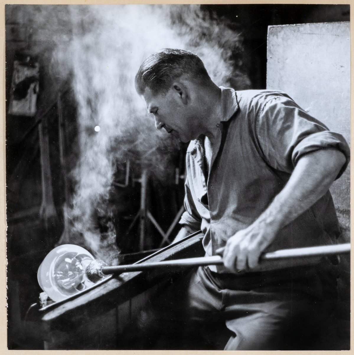 "Herman Axelsson, uppblåsare". Glasblåsaren formar det varma glaset med ett vått tidningspapper.