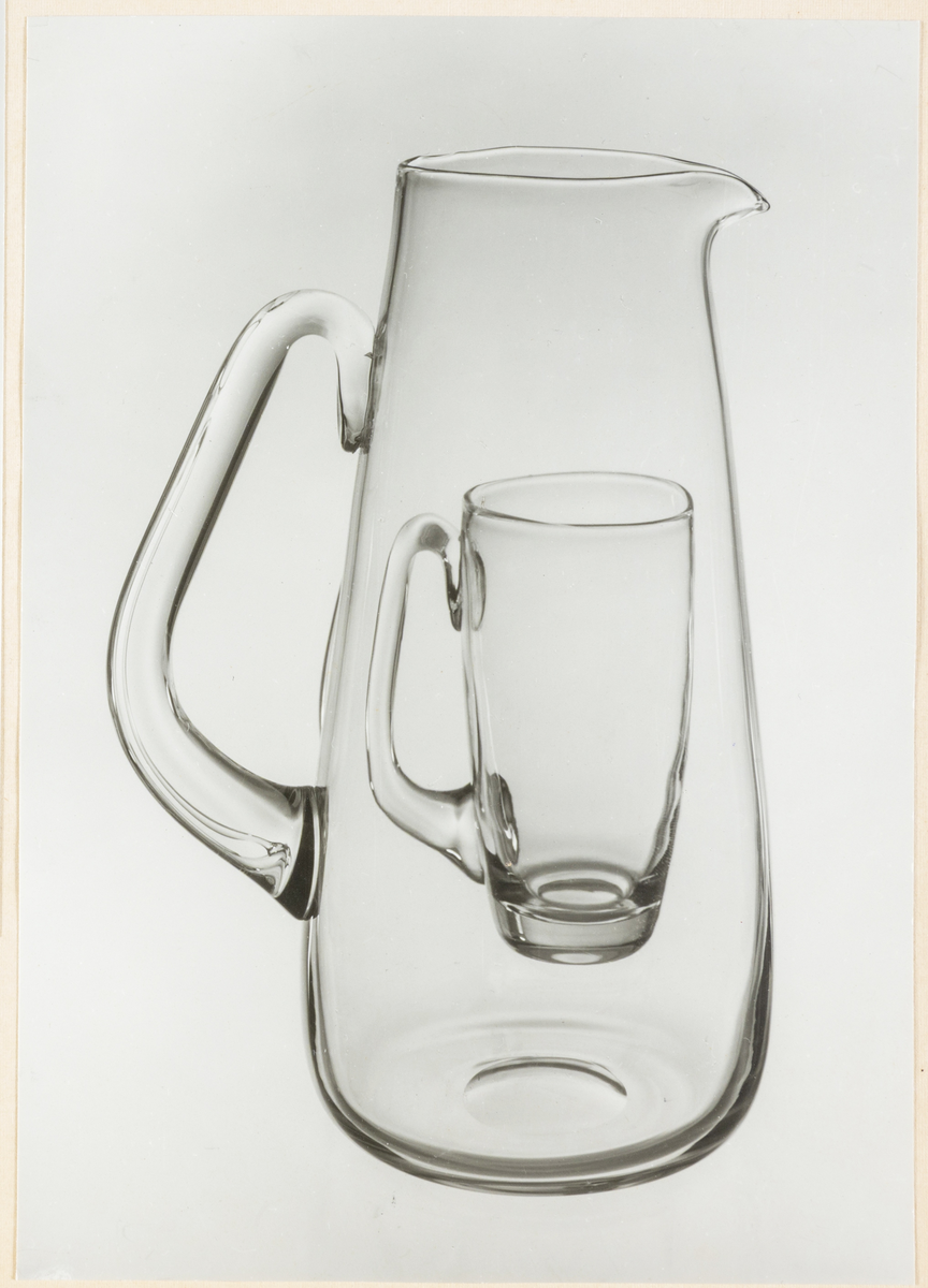 Två något bukiga kannor med snås och handtag, enkel modell i klarglas, Strömbergshyttan, (sedda genom varandra).