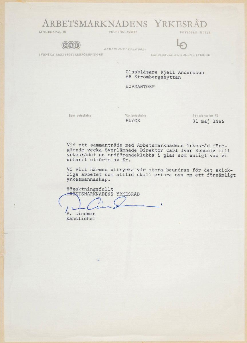 En skrivelse från dåv. Arbetsmarknadens Yrkesråd (31/5 1965), angående en skänkt ordförandeklubba i glas.