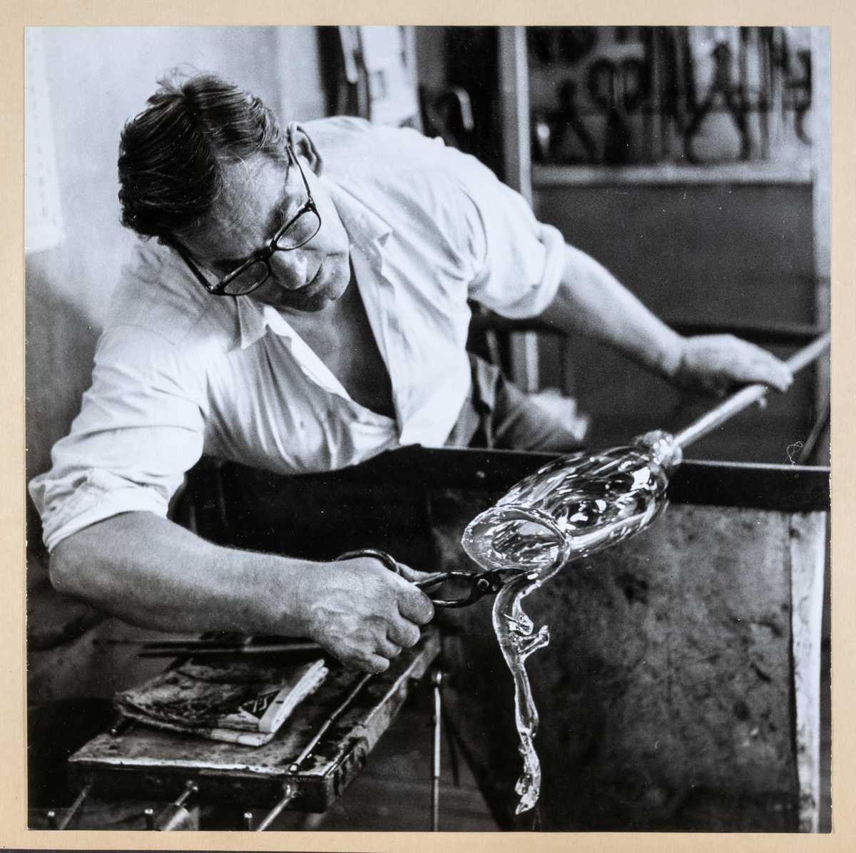 Kjell Andersson i färd med att forma och klippa upp en vas, s.k. drivning.