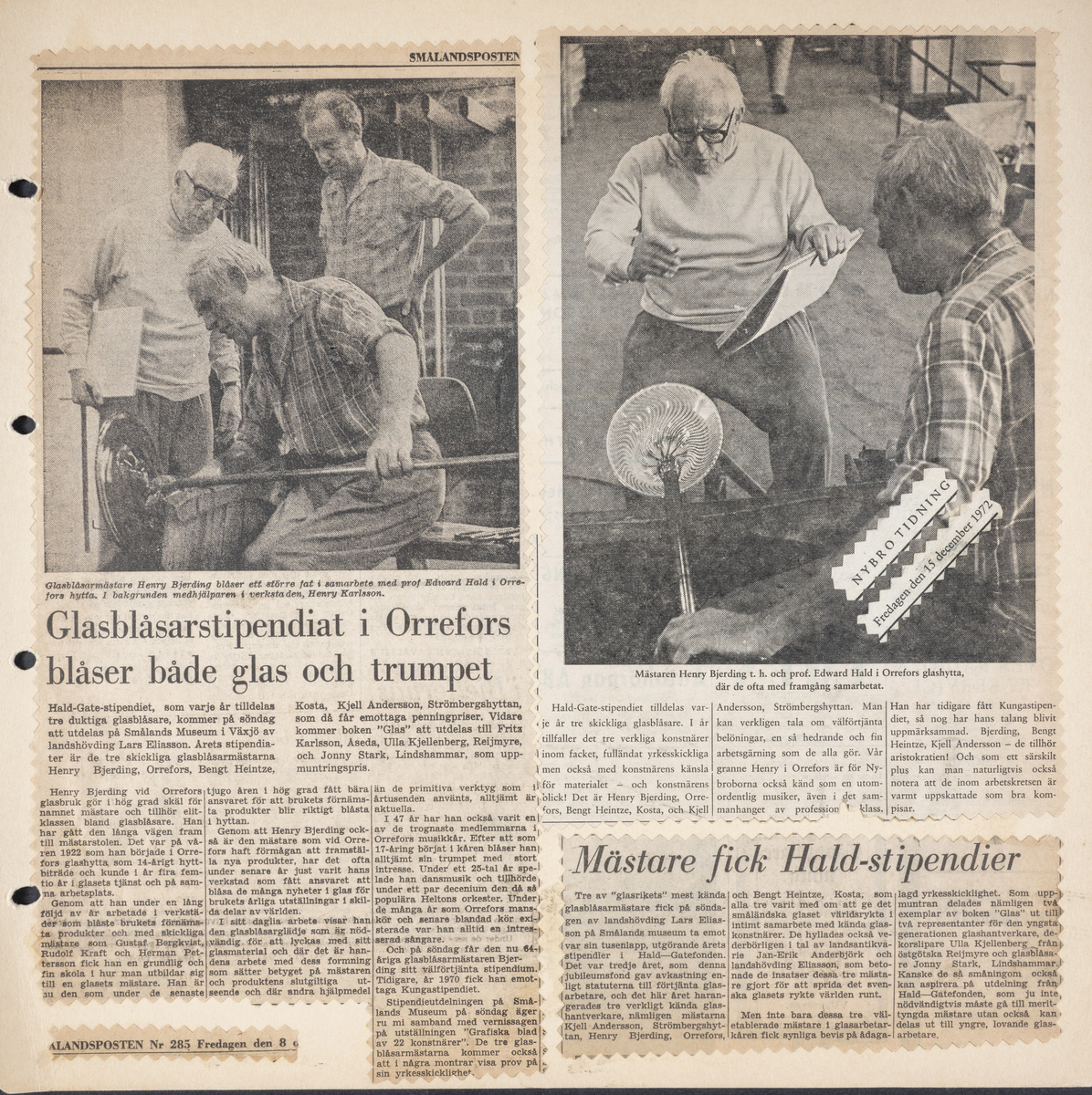 Artiklar angående en av stipendiaterna till Gate-Hald-priset 1972, Henry Bjerding, Orrefors.