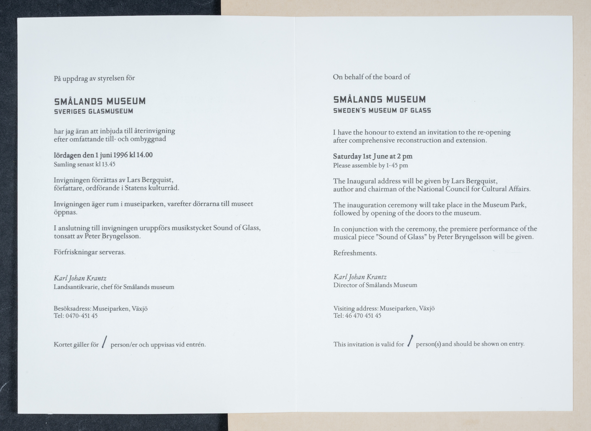 Inbjudan till nyinvigningen av Smålands museum, 1 juni 1996.