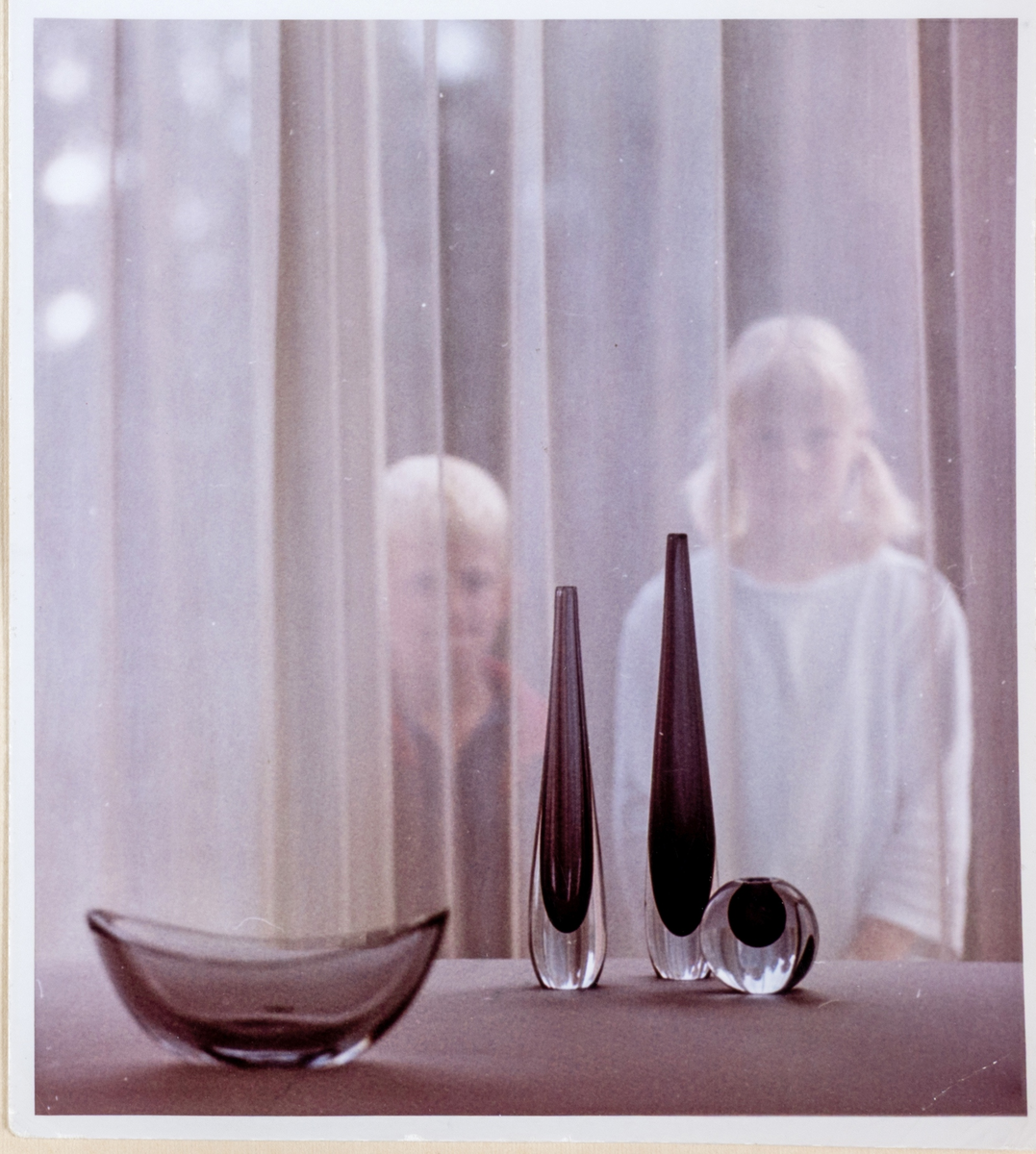 Några vaser och en skål, Strömbergshyttan, med skymten av två barn.