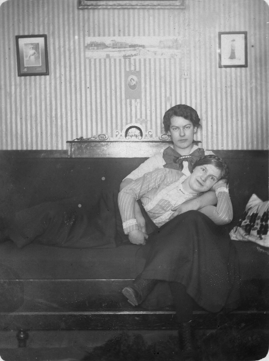 Två unga kvinnor sitter tillsammans i en soffa i en inomhusmiljö. Den ena kvinnan ligger med huvudet vilande i den andras knä. Båda är klädda i blusar med hög halsringning och lång kjol. Bakom dem syns randig tapet, inramade bilder samt ett väggur eller dekorativ väggprydnad. Fotot är troligen taget cirka 1910–1920.