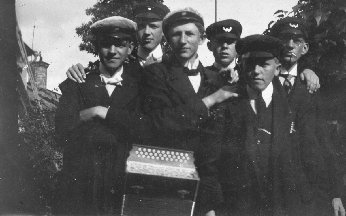 Sex unga män står tätt tillsammans utomhus. De är klädda i mörka kostymer och vita skjortor, flera med fluga eller slips. Flera av männen bär studentmössa och några bär mörka skärmmössor med emblem. En av männen håller ett dragspel framför sig. Flera i gruppen har armarna lagda över varandras axlar och en man har en cigarett i munnen. I bakgrunden syns vegetation samt en byggnad med skorsten. Bilden kan dateras till cirka 1910–1920.
