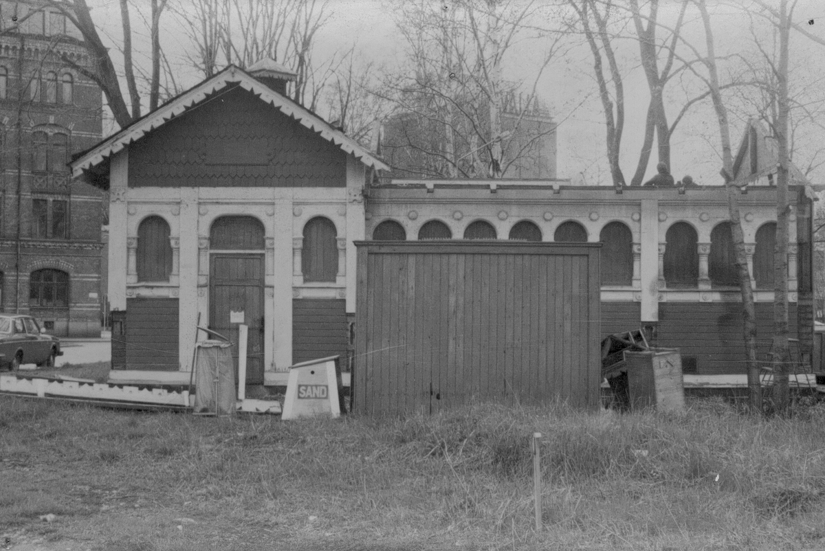 Toalettbyggnad ritad av E.A. Hedin belägen vid spårvägens ändhållplats brevid Tullhuset på Alderholmen under rivning för att flyttas till Boulognerskogen och inredas till offentlig toalett 1977.