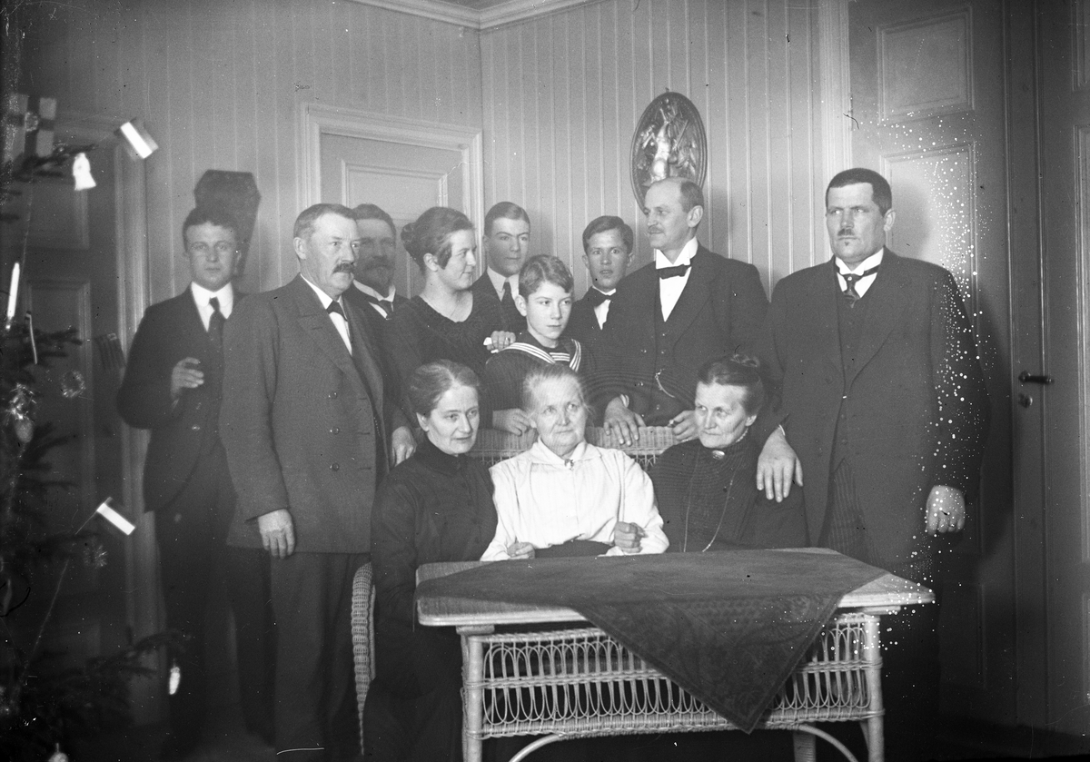 John Hillström står tvåa från vänster, Margta Hillström sitter framför sin man (längst till vänster i soffan), Ragnar Hillström står i mitten längst bak och hans lillebror Folke Hillström står framför honom.sin mor (sjua från vänster).