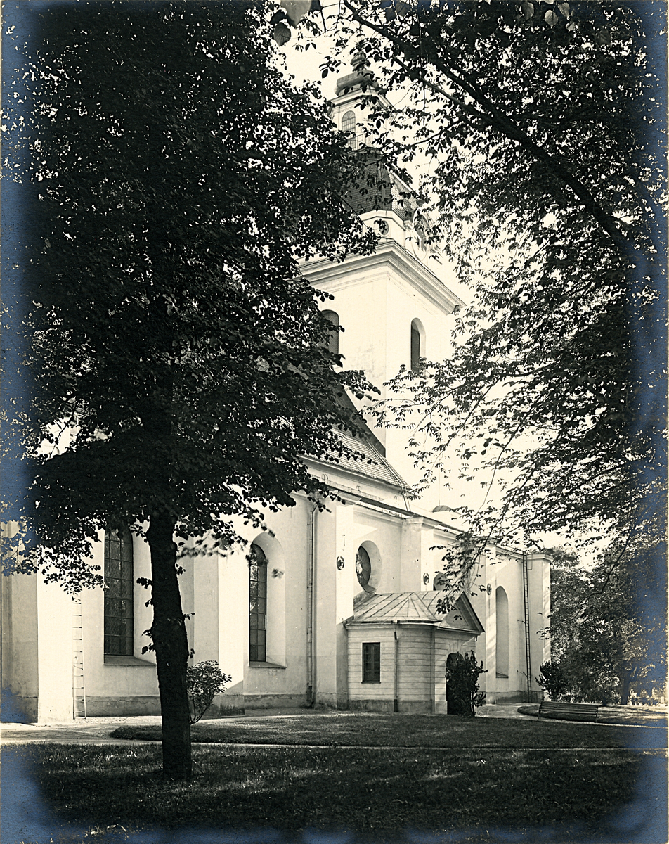 Exteriören av Heliga Trefaldighetskyrkan i Gävle med träd i förgrunden.