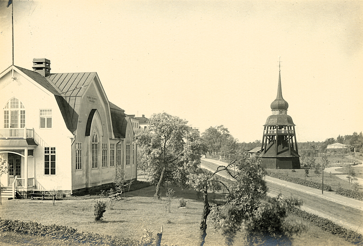 Soldathemmet till vänster och klockstapeln till höger i Regementsparken, Gävle.