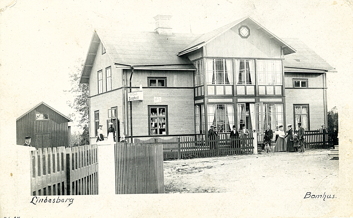 Brevkort med en byggnad vid Lindesberg dit man tog sig från Bomhus genom sightseeingbåt för att bla dansa vid dansbanan, en rekreationsplats.