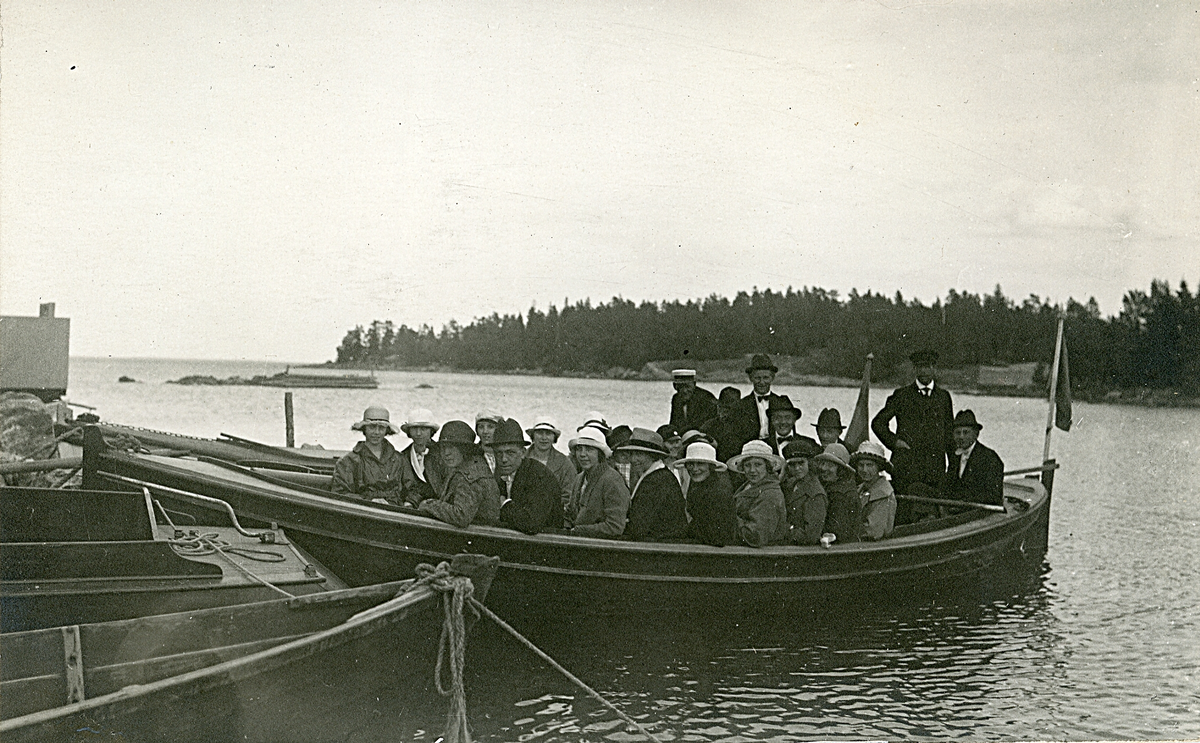 En grupp människor som sitter i en båt och kanske på väg ut på roligheter, tidigt 1900-tal.