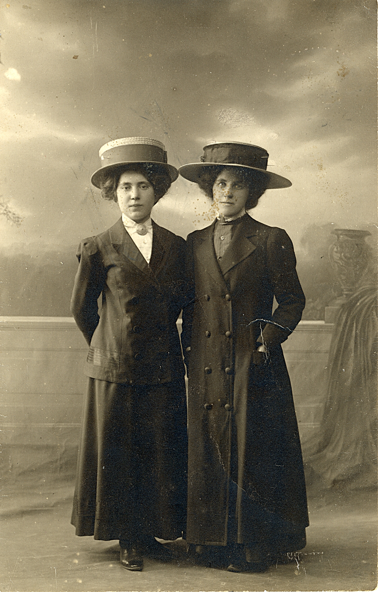 Porträtt av två kvinnor. Text baksida kort: "Gävle den 19/11-1911. Hjärtlig gratulation på namsdagen samt lyckönskningar. Mycken tack för senast. Nu äntligen kommer kortet som jag lovade men bättre sent än aldrig. Min kamrat blev ej riktigt bra, hennes ögon se lite konstiga ut. Kommer nog snart en söndag och hälsar på. Hälsningar Signe H".