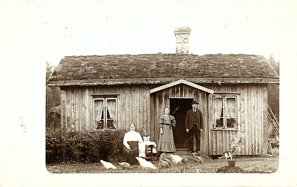 Tre personer framför ett litet torp. Text baksida kort: "Farmor och ? Otto +? i Kärret".