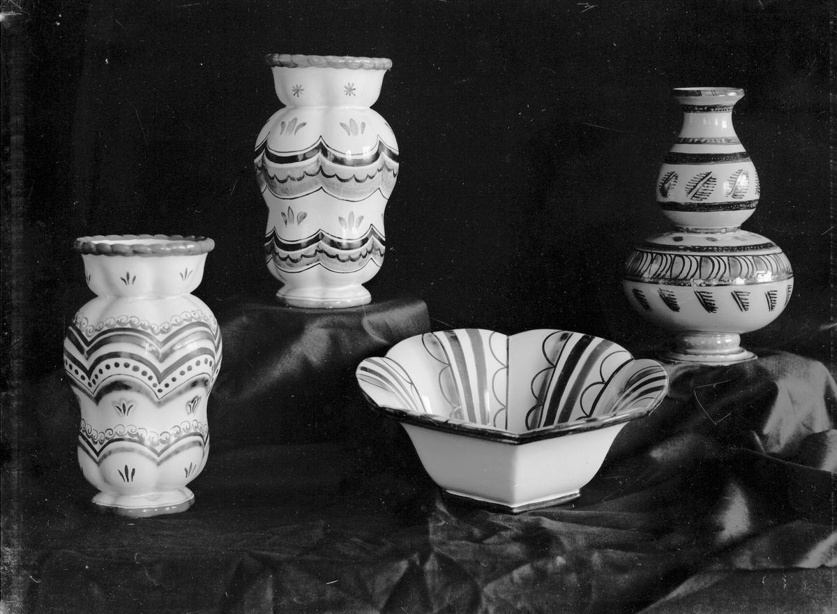 Titel: Tre handdekorerade vaser och en skål från Gefle Porslinsfabrik.