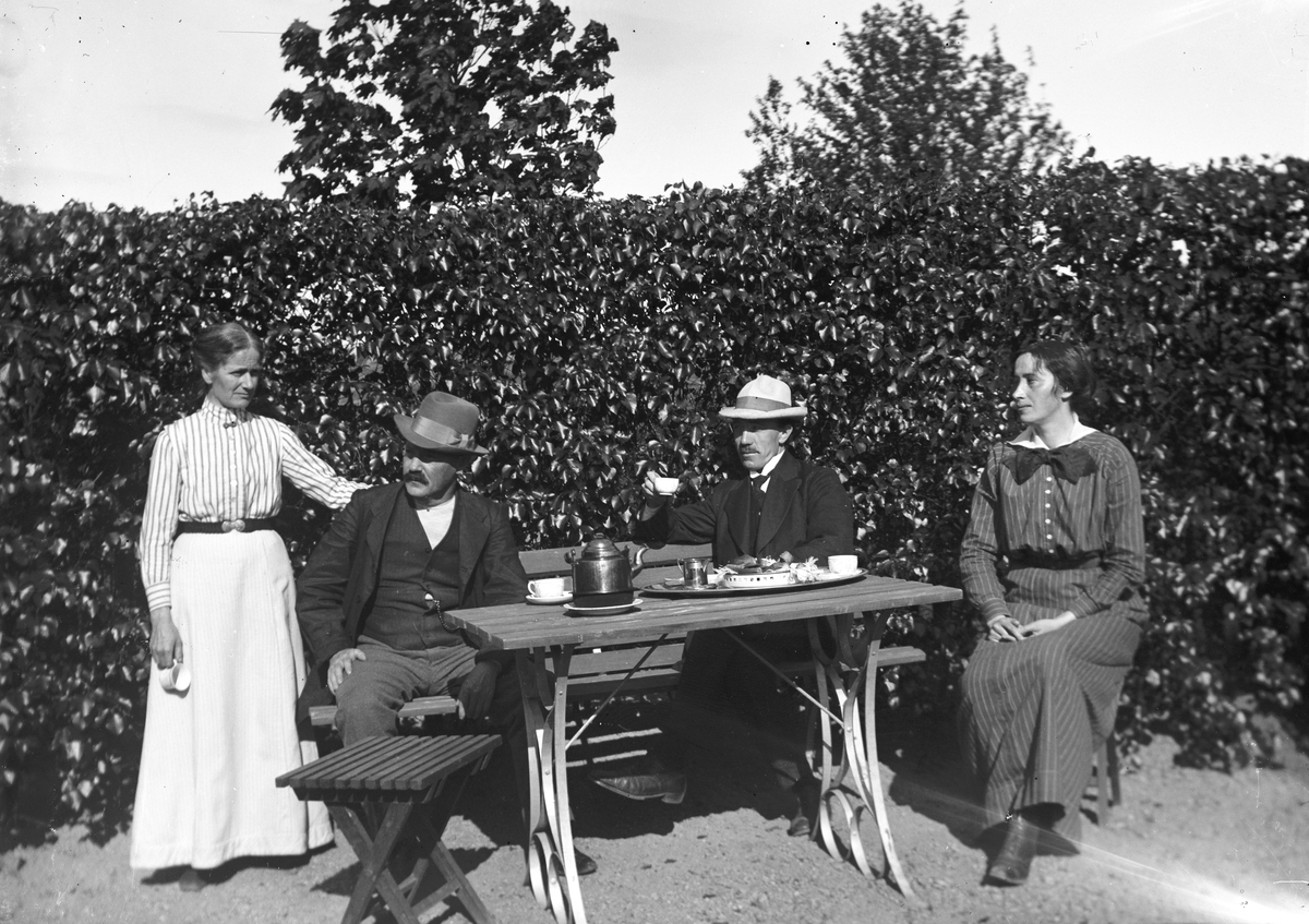 Margta Hillström längst till vänster och bredvid henne John Hillström i Trädgården vid hemmet i Östby.