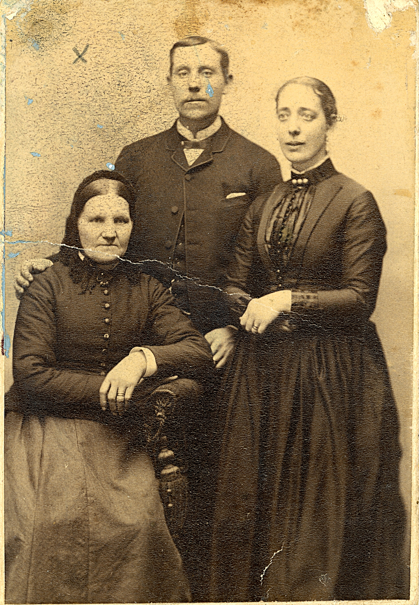 Porträtt av en man och två kvinnor. Text baksida kort: "Ärika" (? resten av texten är svårtydd).