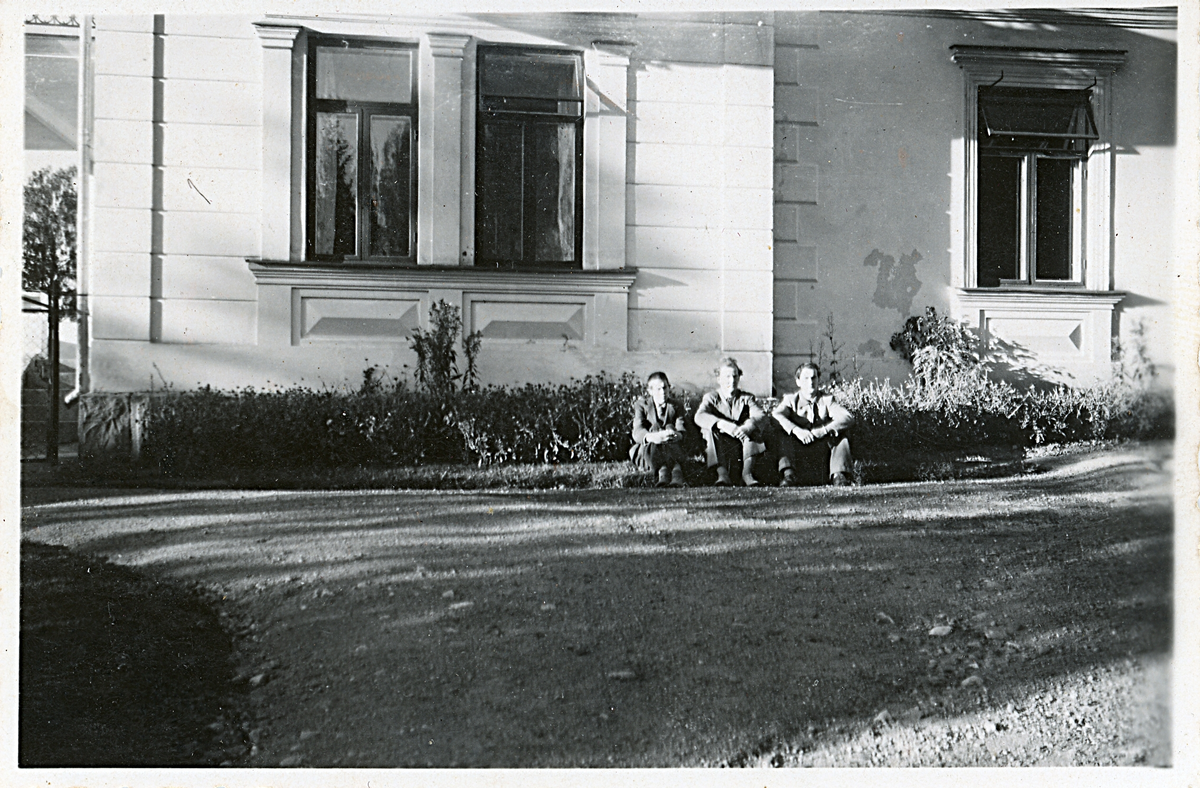 Tre personer som sitter på marken framför ett hus. Text baksida kort: Östanby 1947.