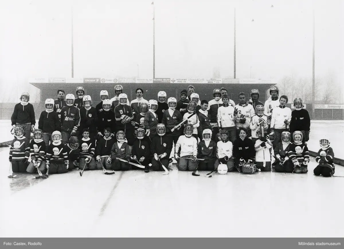Grupporträtt av bandyspelare från Fässberg/Fellows BK. Åby isstadion vid Idrottsvägen i Åby, Mölndal, år 1992.