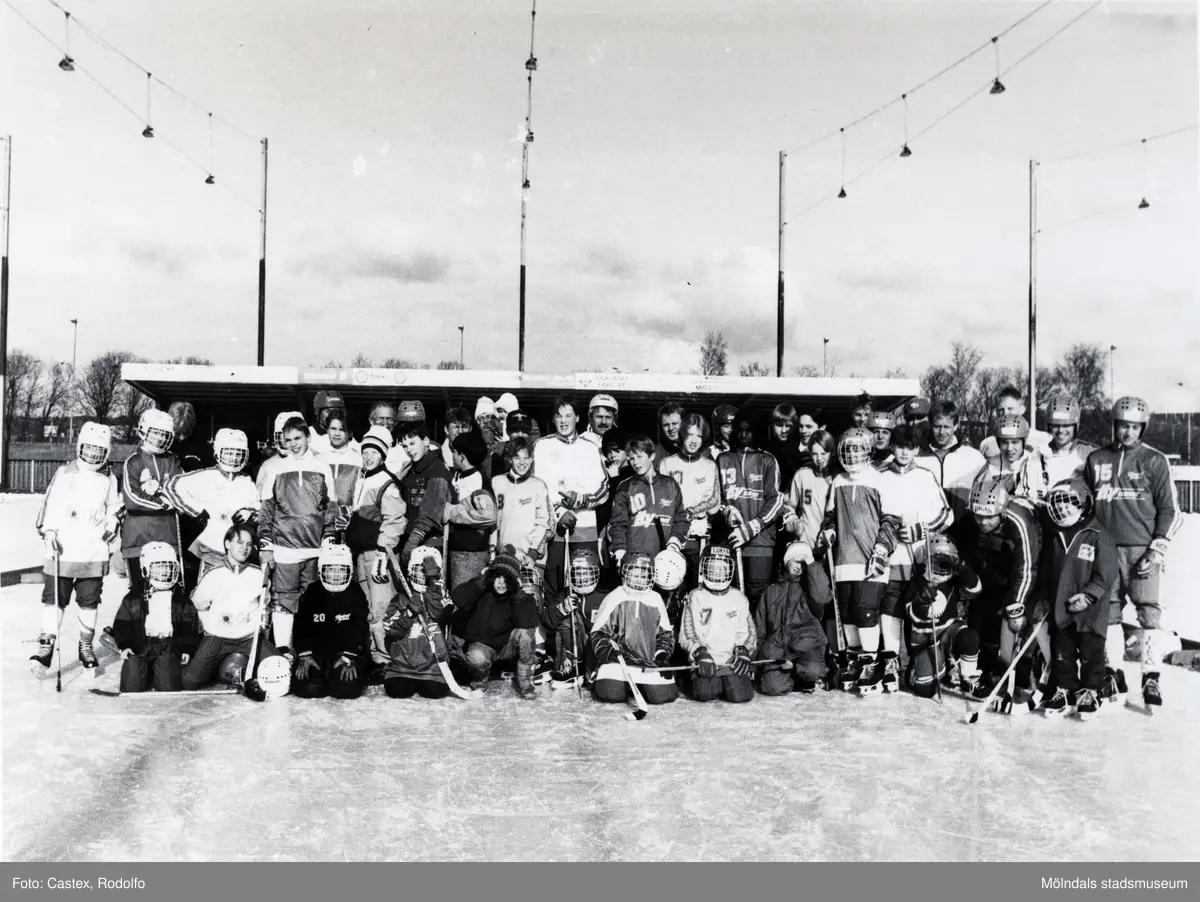 Grupporträtt av bandyspelare från Fässberg Fellows BK och Kållereds SK. Åby isstadion vid Idrottsvägen i Åby, Mölndal, på 1980-talet.