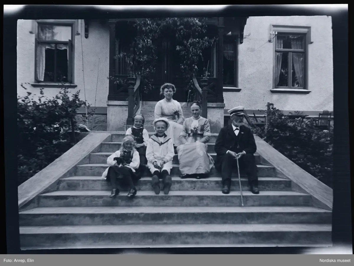 Elin Morthensen (född Anrep) med sina barn och föräldrar, porträtterade på trappen till familjen Morthensens villa Solveden, Djursholm.