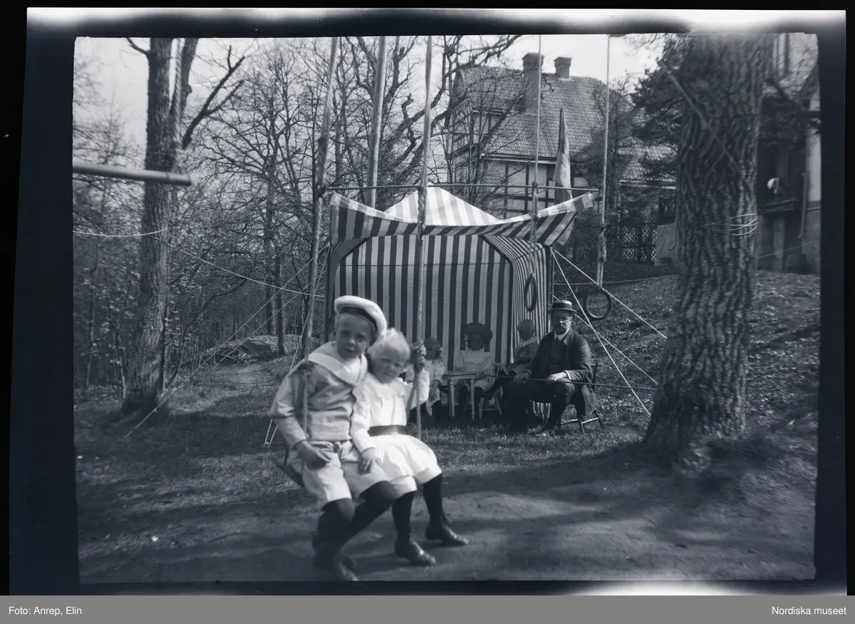 Leonarth och barnen Morthensen leker ute i trädgården, i gungorna och i ett litet randigt tält.