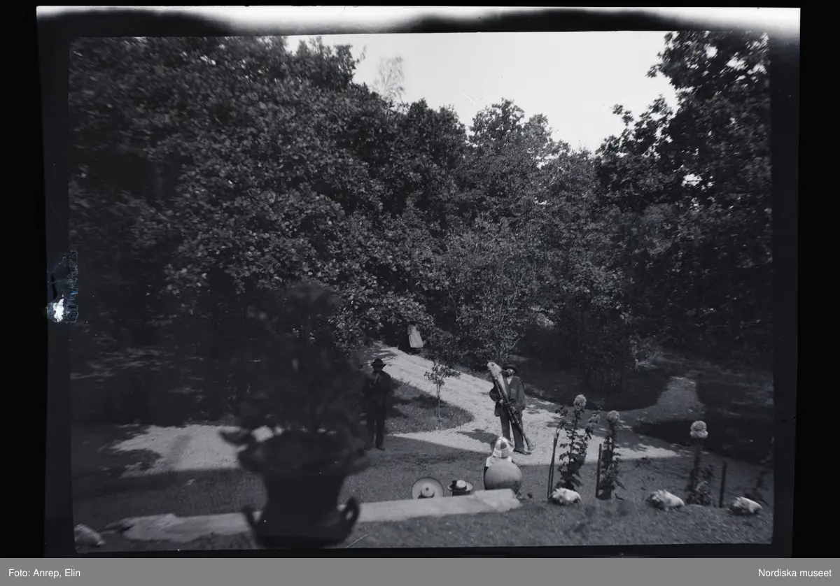 Ett par besökande män spelar musik på varsitt blåsinstrument. De står på gårdsplanen framför villa Solveden, Djurholm.