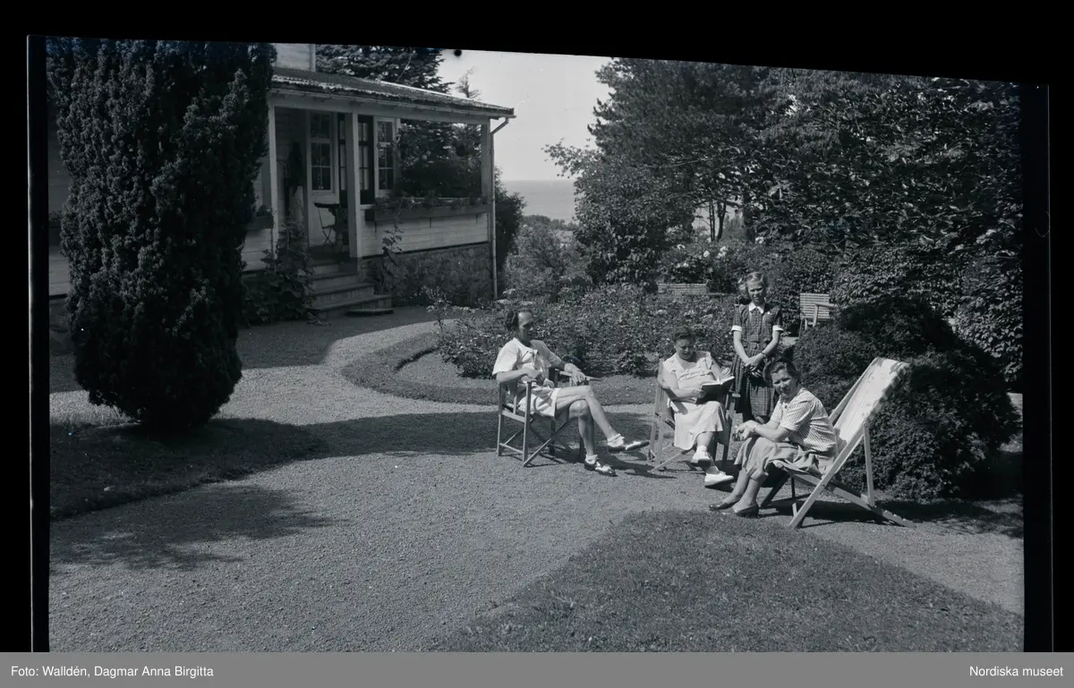 Ett sällskap sitter ute och fikar i en trädgård.