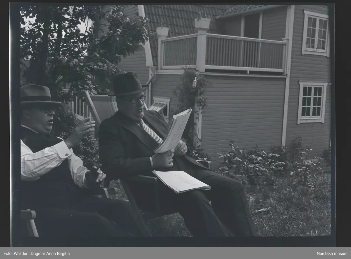 Två män sitter ute i en trädgård och sjunger.