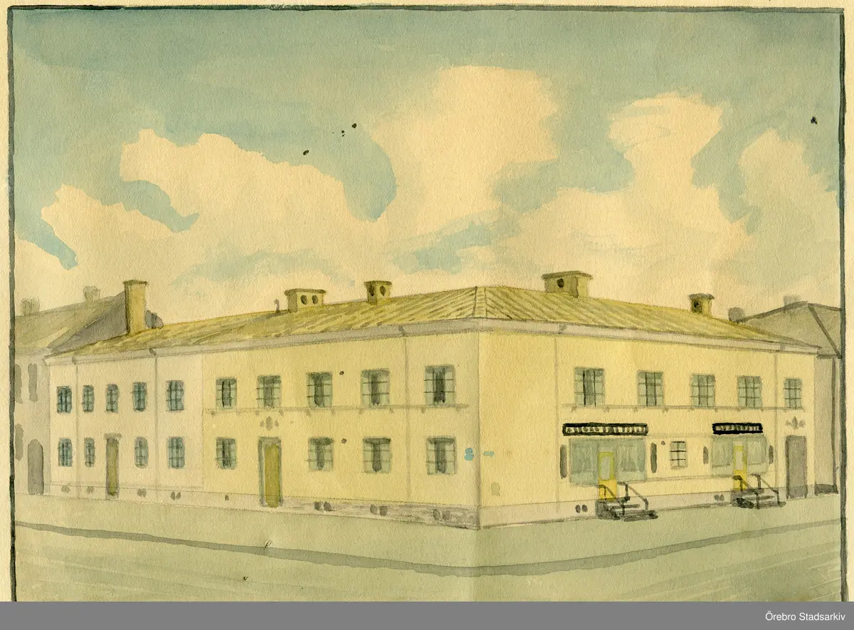 Akvarellmålning av lägenhetshus i Örebro