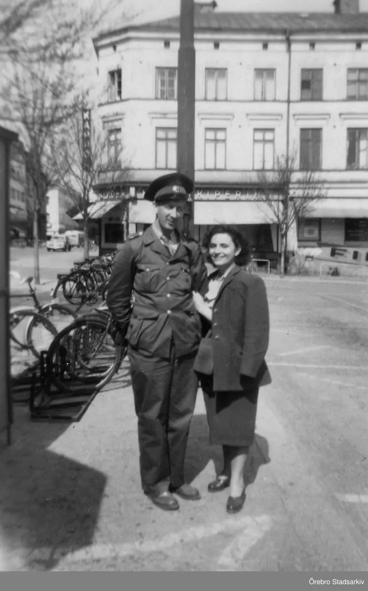 Man i chaufförsuniform och kvinna på Våghustorget i Örebro