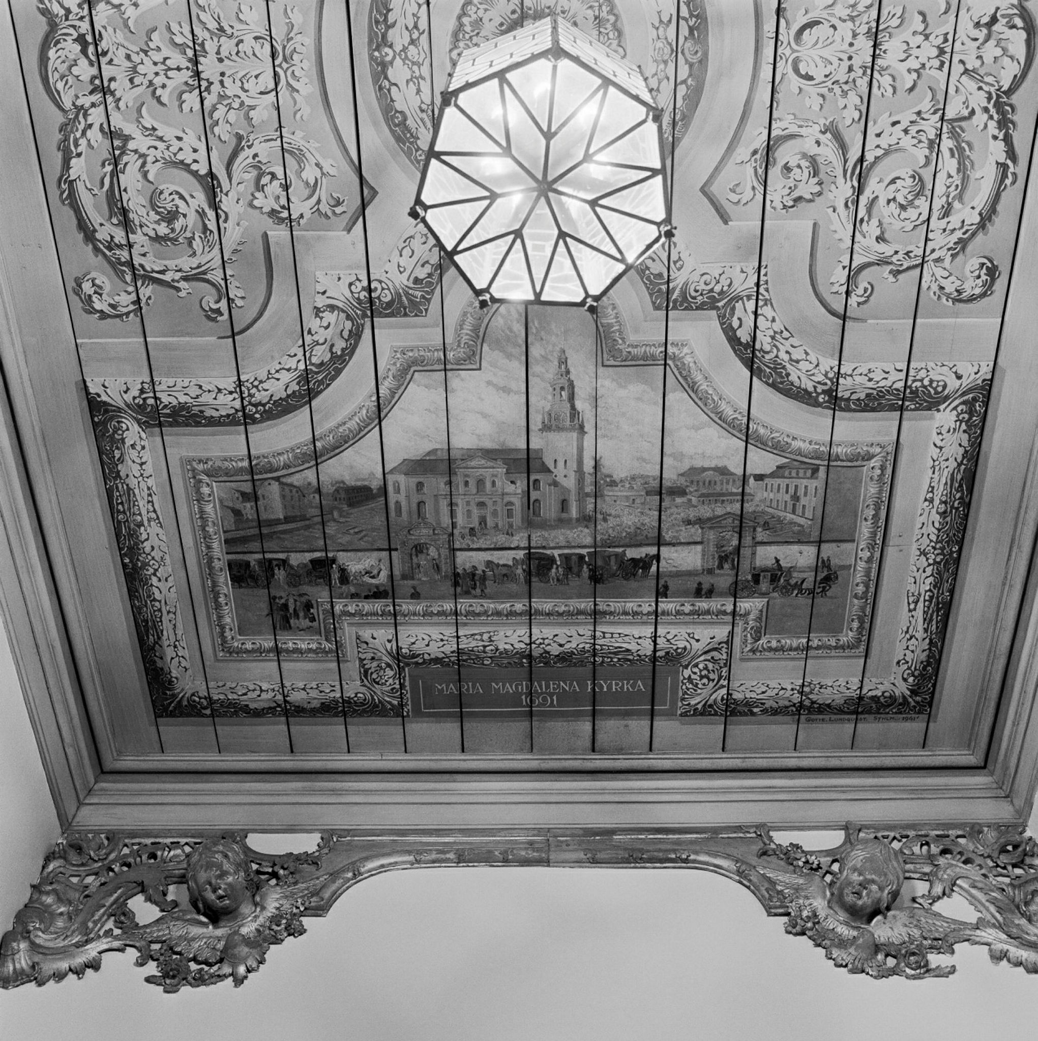 Målat brädtak på Sankt Paulsgatan 10 föreställande Maria Magdalena kyrka.