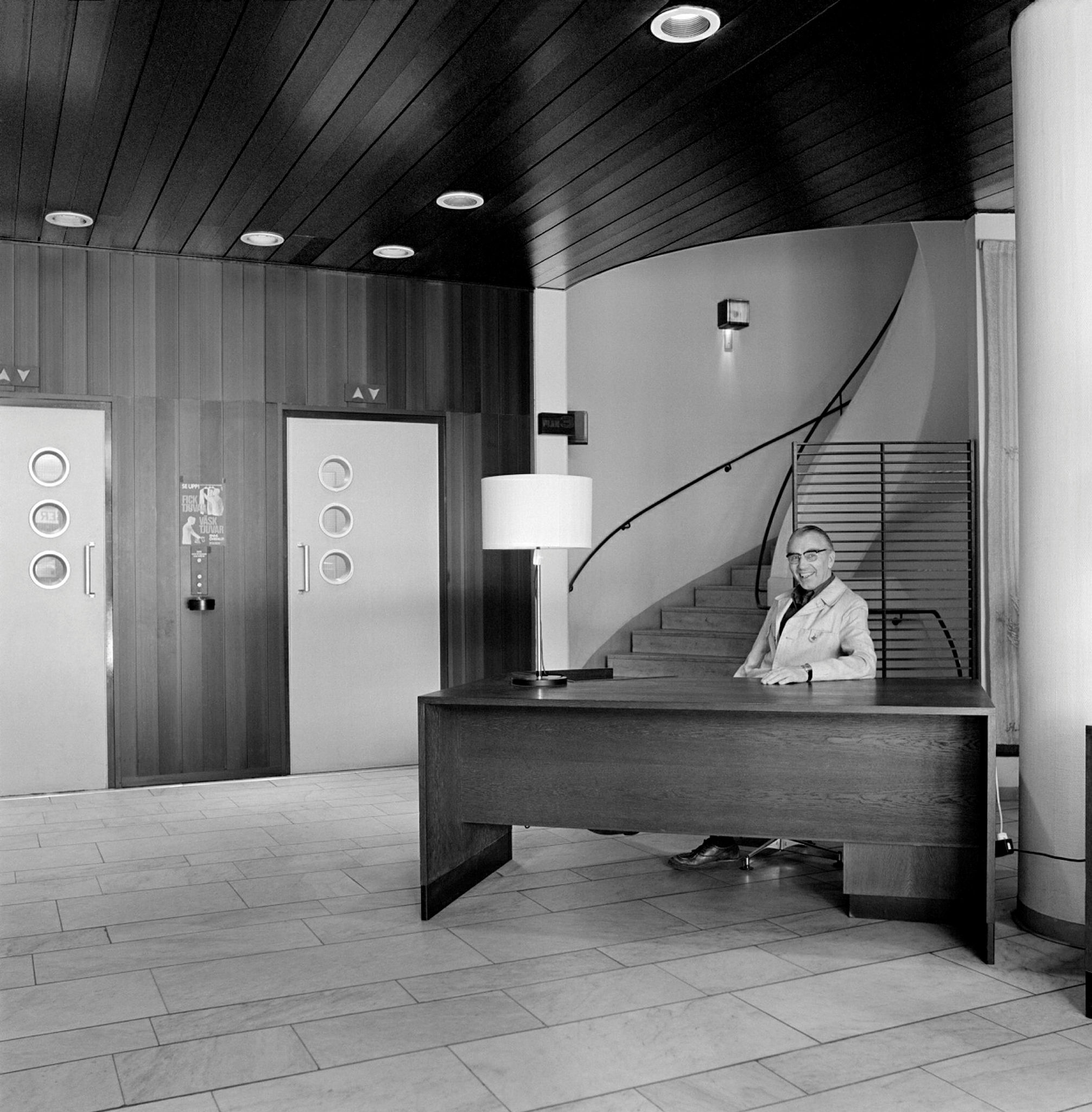 Entrén till Drottninggatan 29, Sparbankernas hus, med vaktmästaren vid bordet.