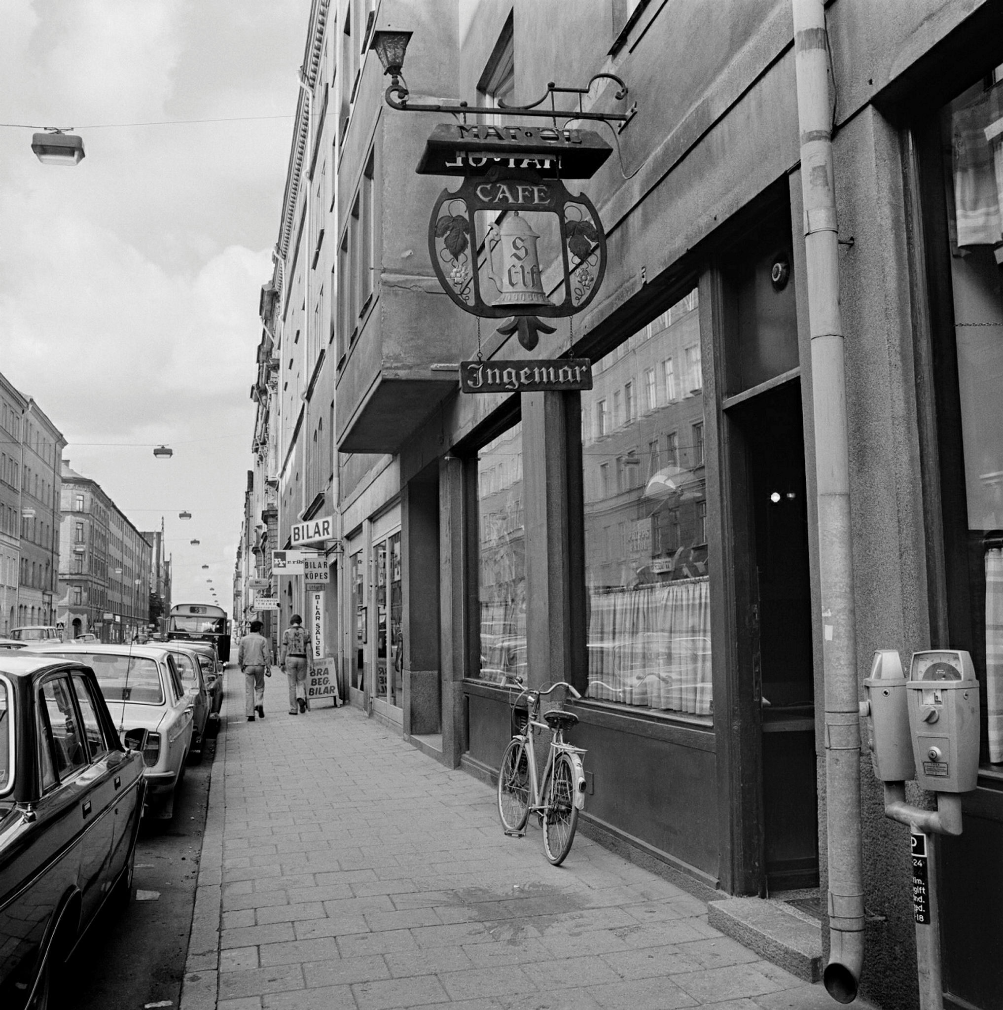 Titel: Gatuvy norrut från Roslagsgatan 38. Café Ingemar närmast till höger.