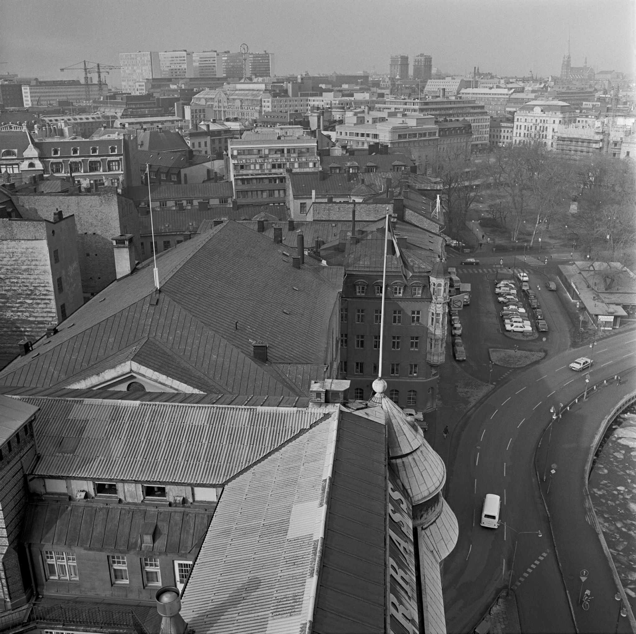 Utsikt mot Musikaliska Akademien, Berzelii Park och City. Fotografen står i tornet på Hotell Strand.