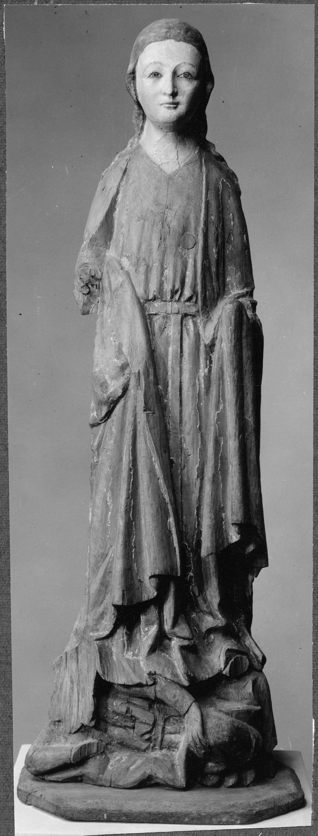 Skulptur, möjligen föreställande Sankta Margareta, trä, omkring 1300.